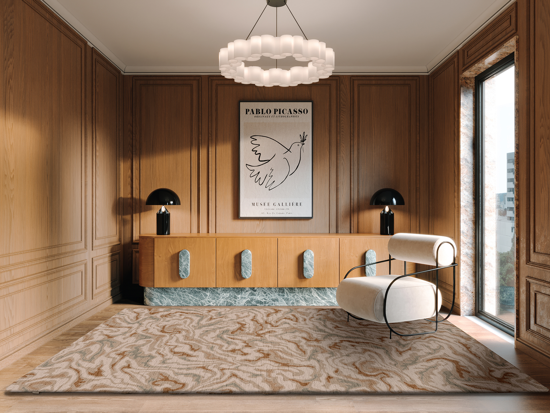 Arabesque is a tufted rug collection inspired by the delicate moment when sea waves break onto the shore and dissolve into soft, white foam. This natural poetry is translated through a luxurious blend of wool and Tencel. Wool offering warmth, resilience, and comfort, while viscose adds a refined, liquid-like sheen evocative of shimmering water.